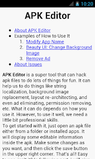 First, you need to add a file for editor: Drag & drop your apk file or click inside the white area for choose a file. Then click the edit button. Mar 25, 2019 · how to play apk editor on pc,laptop,tablet 1.download and install android emulator on pc,laptop,tablet.click "download emulator" to download. Feel free to contact us to ask a question, report a bug, or suggest your improvements and ideas.